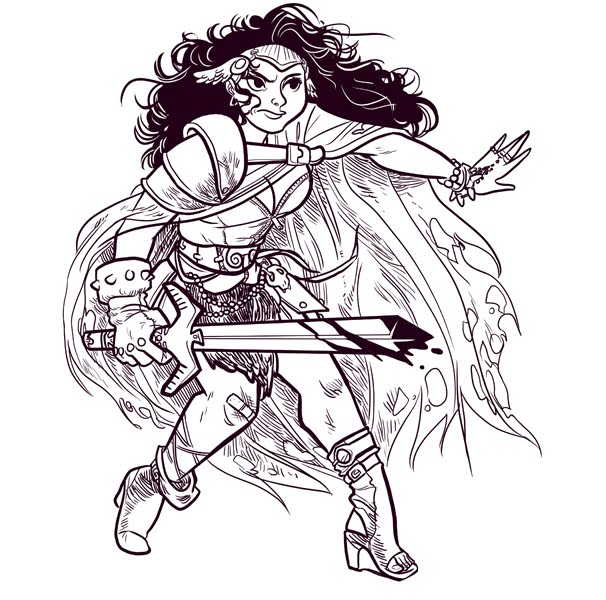 i rendered the head a bit to try out different shadings and brushes to get the look i want, and now i've blocked the rest in, except for his weapons. not sure about the arm poses.